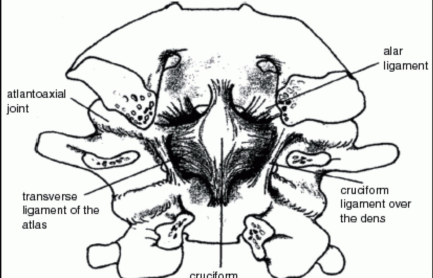 In axial rotation of C2, the AL on the contralateral side of rotation limits the degree of rotation. When the head is fixed and lateral bending is performed, the atlas will remain fixed with the head, and when the AL are intact, the tension on the contralateral AL ligament will cause the spinous process of C2 to deviate to the contralateral side. The accessory AA ligaments prevent excessive lateral slippage of the lateral masses. As an exercise in biomechanics, let's look at Jackson's description (Figure 2) of ligamentous injuries to the C1-C2 articulations: